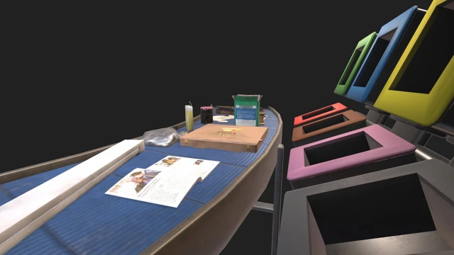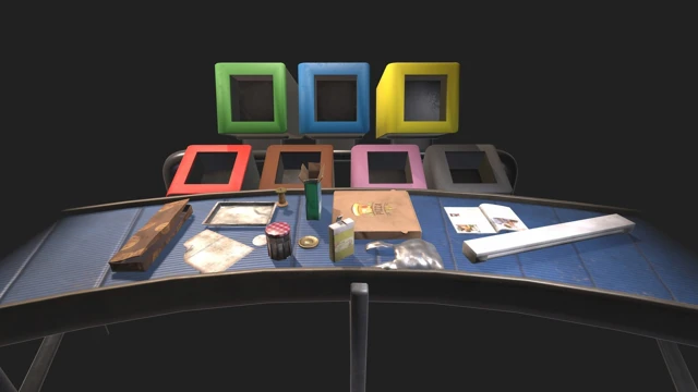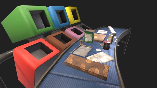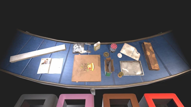 Aluminum tray, Laundry detergent box, Plastic bottle, Pizza box, Cotton pad, Metal lid, Sheet of paper, Shower gel bottle, Magazine, Neon light, Cake package, Jam jar, Plastic bag, Apple core.
