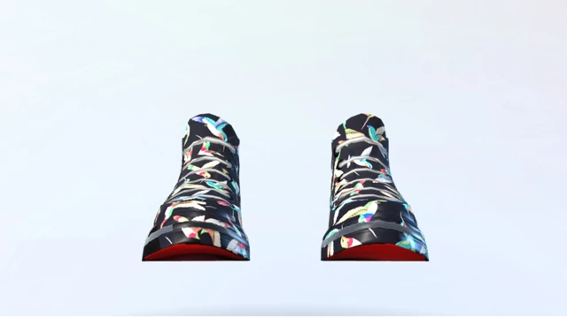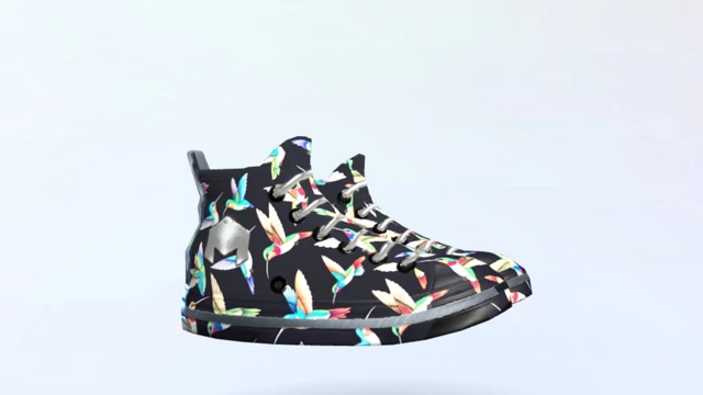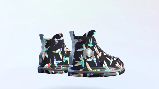 Lightweight hummingbird pattern with metal laces, alloy M mark, and a metal-bound sole.
