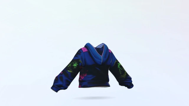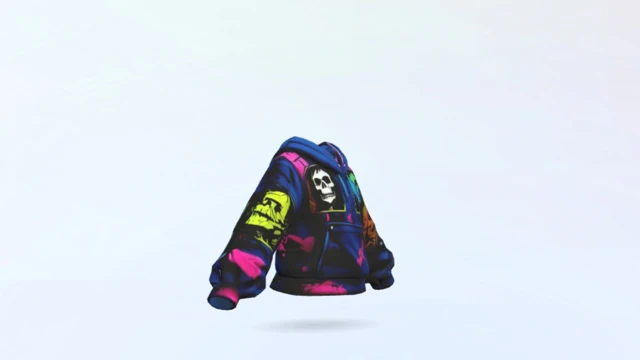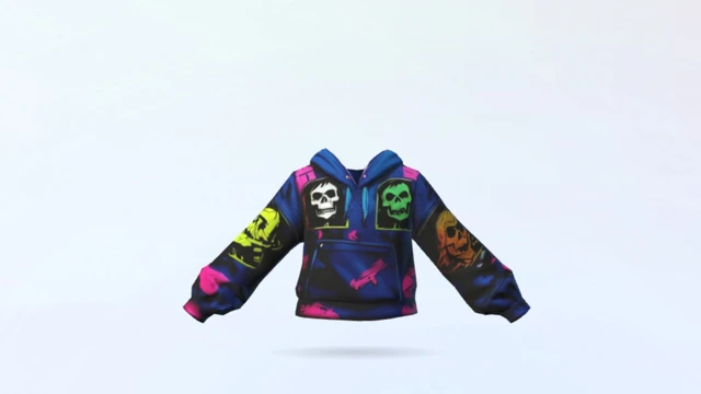 Electric neon skull graphics layered across a deep blue hoodie. Loud color hits, heavy contrast, and a cyber-graphic feel built for late nights and virtual spaces. A bold visual staple without taking itself too seriously.