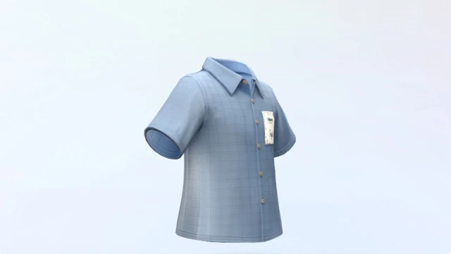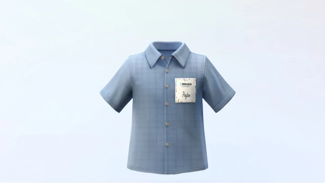 Short-sleeve button-up with a casual office vibe and a handwritten name tag that reads “Peyton.” Low stakes, slightly awkward, and perfect for showing up anyway. No cake guaranteed.