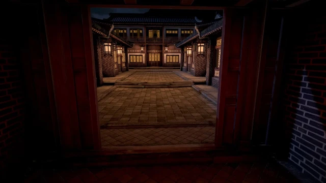 A narrow streetside area lit by lanterns, windows and the moon. Features breakable doors that allow you to enter side buildings.