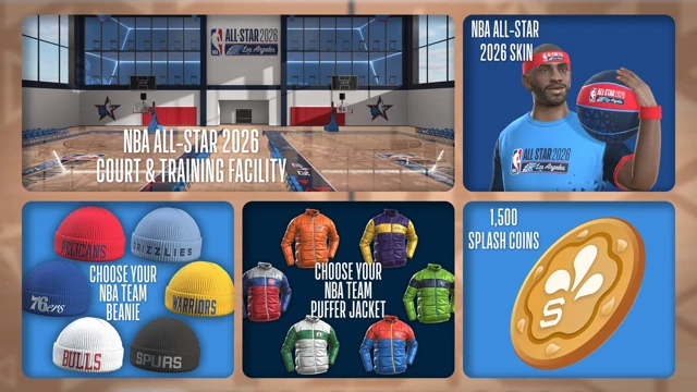 Introducing the NBA All-Star 2026 Pass! Earn NBA All-Star 2026 cosmetics and courts, NBA team cosmetics, and over 1750+ Splash Coins.