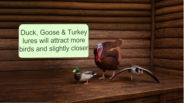 Improve your hunting results with the Bird Lure Pack — a set of three realistic lures designed to attract birds during your hunt. This pack includes specialized lures for ducks, geese, and turkeys.