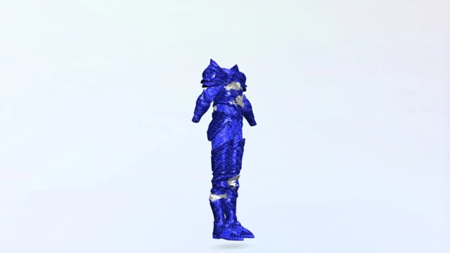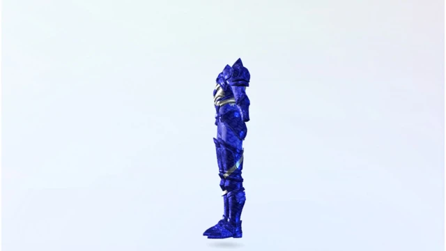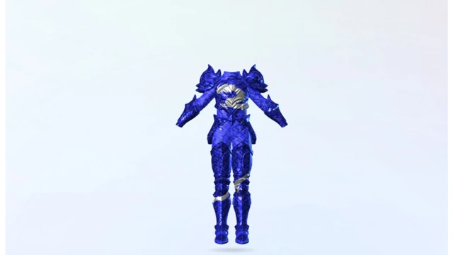 Cobalt-blue plate armor with liquid silver wyrm detailing. Full-body one-piece designed for high contrast fantasy looks across supported virtual environments.