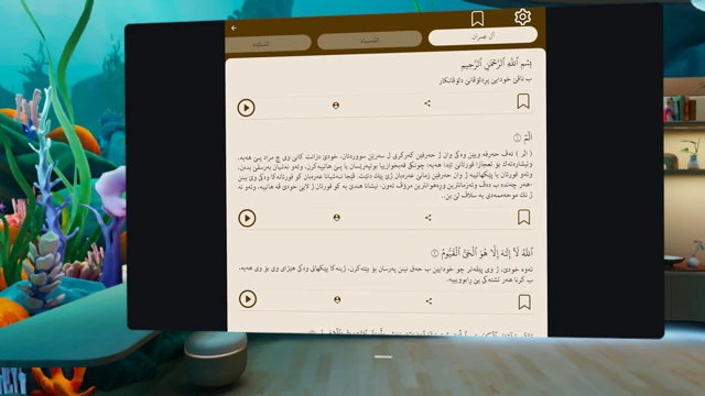 ئێك: بەشێ قورئانا پيروز و تەفسيرێ، كو تو دشێی ل ڤى بەشى قورئانا پيروز و تەفسيرێ ب خينى، و ل ديڤ ئارەزويا خو قەبارێ فونتێ قورئانێ و تەفسيرێ ب گوهرى. هەروەسا تو دشێی گوهداريا قورئانێ بكەى ئەڤە ژى ژ بو وان كەسێن خاندنا وان لاواز دێ مفاى ژێ بينن.
