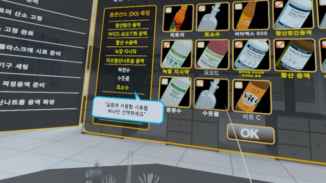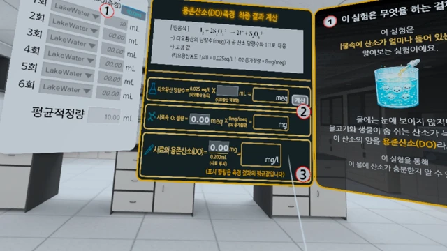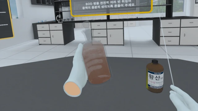 본 콘텐츠는 윙클러 변법을 기반으로 수중 용존산소(Dissolved Oxygen, DO)를 정량적으로 분석하는 가상실험 콘텐츠입니다. 학습자는 실제 실험 절차와 동일한 단계 구조를 따라가며 시료 채취, 시약 첨가, 산소 고정 반응, 침전 생성 및 용해 과정, 적정 수행, 종말점 판정까지 전 과정을 체계적으로 경험할 수 있습니다. 각 단계는 단순한 조작 수행이 아니라 화학 반응의 원리와 실험 목적을 이해하도록 구성되어 있어, 실험 과정과 이론 학습이 동시에 이루어집니다.