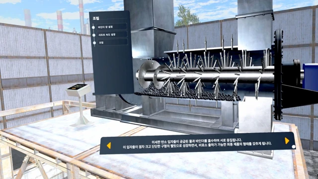 사용자는 반응, 포집, 건조에 이르는 전체 공정 흐름을 따라가며 주요 설비의 작동 원리와 운전 절차를 이해할 수 있습니다. 또한 실제 작업 환경을 반영한 인터페이스를 통해 장비 조작, 공정 변수 이해 등을 단계적으로 학습할 수 있습니다.