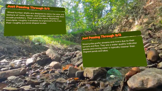BRWC: Wood Turtle Habitats is an exploration of the ecosystems inhabited by the North American Wood Turtle (Glyptemys insculpta), which thrives in the eastern part of the United States and Canada. Designed as part of an interdisciplinary online curriculum, this relaxing educational VR experience uses pop-up information and 360 videos, including underwater footage, to show you a turtle's perspective on the world. Bask on a log, explore low-lying areas, and swim in turbulent streams. Learn to think and live like a wood turtle!