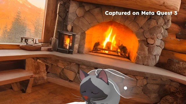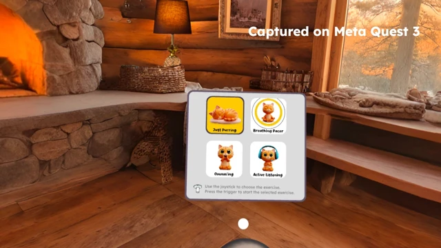 Place your controller on your chest and the world transforms into a cozy cabin. Your cat curls up and purrs — and you'll feel it through gentle haptic vibrations. Follow guided breathing exercises that sync with the purr's rhythm.