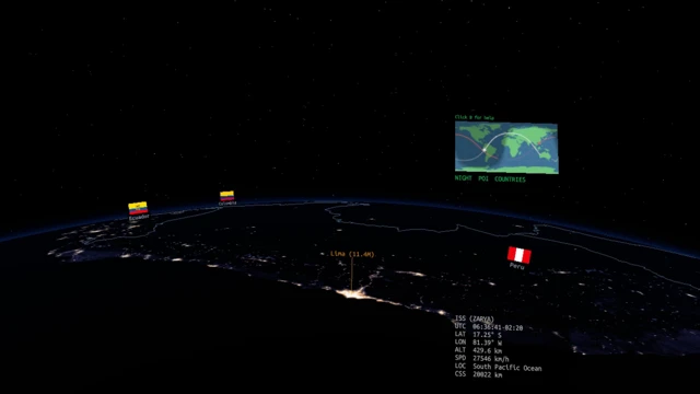 Two camera views are available: forward and straight down. Points of interest — cities, mountains, lakes, rivers, deserts, islands and more — are labeled on the surface ahead of the station. Country borders, names, and flags are shown for all 195 countries (193 UN member states and 2 observer states). A time offset lets you rewind the simulation to see where the station was in the recent past. A heads-up display shows latitude, longitude, altitude, speed, and the country or sea below.