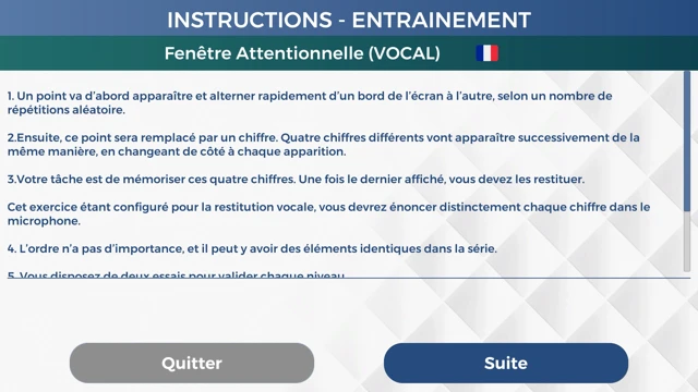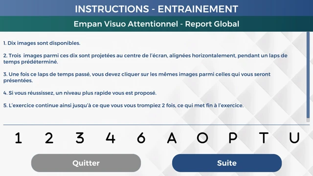 To date, three exercises have been implemented: Visuo-Attentional Span (EVA) in global report mode, EVA in isolated report mode, and Cardiac Coherence.