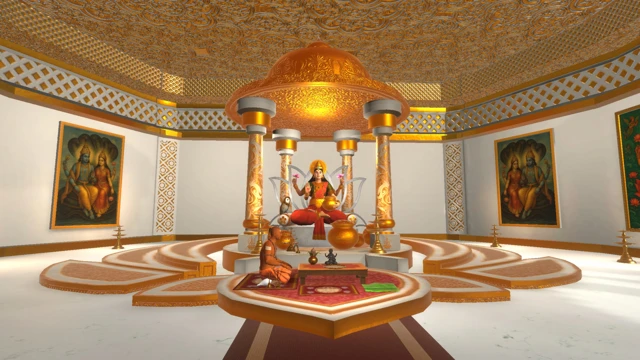 The temple is designed in a semi-realistic visual style inspired by classical Indian architecture with a calm, devotional atmosphere. You are free to explore the temple space at your own pace and observe the surroundings. Soft ambient background music supports the experience without overpowering the chants, creating a soothing mood.