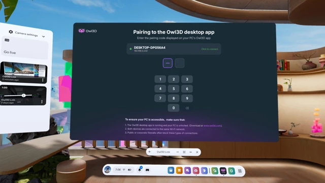 To get started, download and install the Owl3D desktop app on your Windows PC or Mac. Ensure your headset and PC are connected to the same router, launch Owl3D Link, and select your PC. The app handles the rest—converting your content to stereoscopic 3D and streaming it directly to your headset.