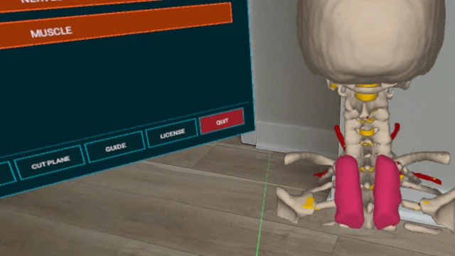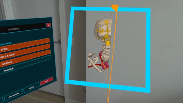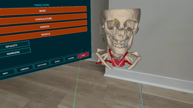 Grab, rotate, and scale volumes with Quest controllers. Toggle independent tissue layers — bone, vasculature, nerves, and muscle — each rendered as a high-quality mesh using AI segmentation. Slice through anatomy with dual adjustable cut planes, fine-tune opacity to reveal deep structures, and place color-coded markers to annotate landmarks or injection sites during teaching.