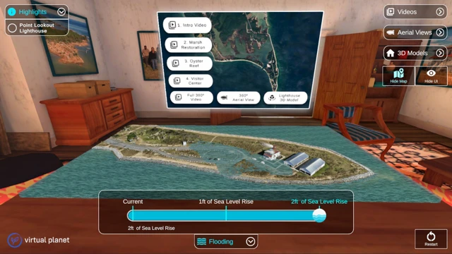 Sea Level Rise Explorer: Point Lookout brings you into Point Lookout State Park through an immersive VR experience built with 360-degree video, aerial drone footage, and interactive 3D models.