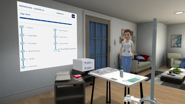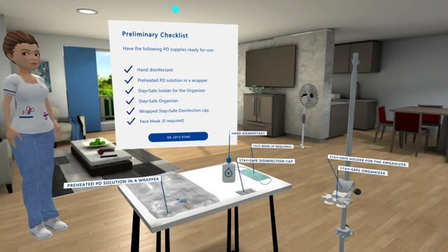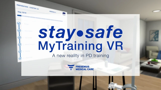 The stay•safe MyTraining VR is a digital tool that helps dialysis clinics train patients or educate healthcare professionals for manual peritoneal dialysis with the stay•safe CAPD system. It is only supplementary to the personal training of patients and Healthcare Professionals.