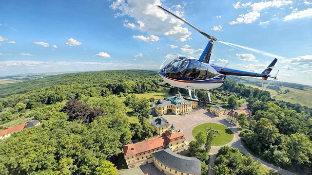 Your flight starts right above the iconic Theaterplatz. Below you: the National Theatre and the Goethe-Schiller monument – a powerful tribute to genius. Hanging outside the helicopter, you drift above narrow streets and classic architecture. You follow the curve of the main shopping street, cross over the lively market square, and pass the Herzogin Anna Amalia Library – a UNESCO World Heritage site that was destroyed by fire in 2004 and lovingly rebuilt.