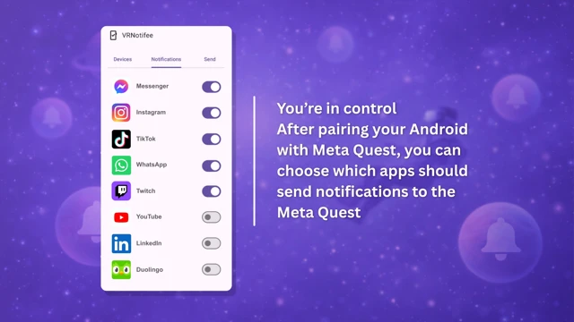 - Background notification service - Runs in the foreground service to reliably listen for notifications and send them to Quest. The service can be stopped at any time by the user.