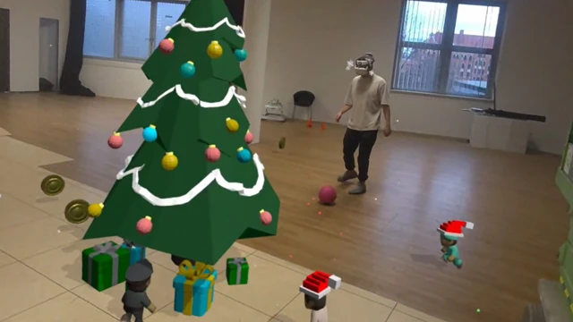 Before the action starts, you set everything up using only hand tracking. Place your tree, position your starter package, adjust the ball size, and define your play area with simple gestures. Once the game begins, virtual elements blend naturally with your room using passthrough, adaptive brightness, and depth features that make the elves feel grounded in your real environment.