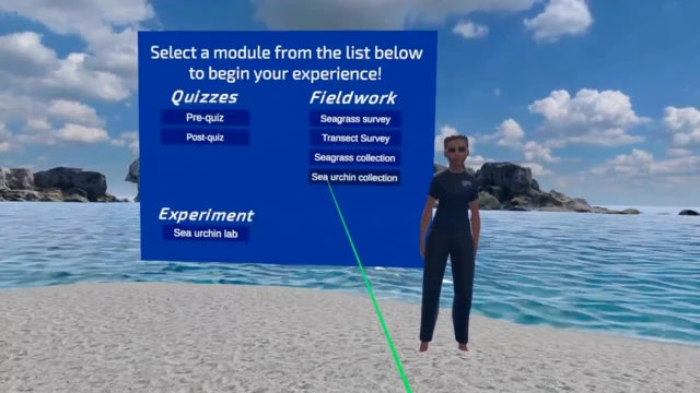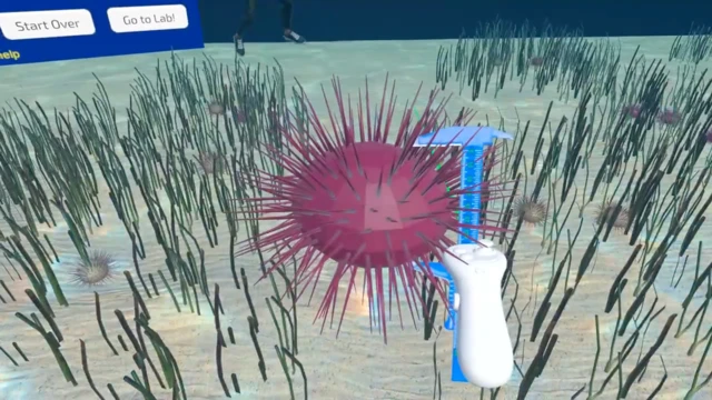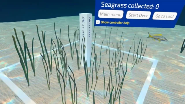 Coastal Underwater Research: Virtual Experiences are a series of virtual reality (VR) modules to provide virtual research experience to academic individuals in the marine science field. This particular module features tools and techniques used for a real-world experiment conducted by Erin Johnson. Users can learn about and conduct essential fieldwork tasks needed to run an experiment that investigates how seagrass defenses affect sea urchin consumption. Seagrass defences are related to the "day of seagrass collection." In the experiment module, users can manipulate variables known to significantly affect sea urchin consumption and receive simulated data based on a built-in equation from the real-world experiment. Users are encouraged to design an experiment, analyze the data received, effectively communicate their results through various forms of infographics and tag the creator!