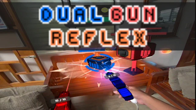 Experience Dualgun Reflex, a high-octane mixed-reality shooter designed exclusively for Meta Quest. In this stationary VR game, you’ll dual-wield a red gun in your left hand and a blue gun in your right, facing waves of color-coded enemies that appear dynamically in your real environment. Your reflexes are your greatest weapon—shoot the right color, dodge slow-moving projectiles, and survive each escalating wave of combat.