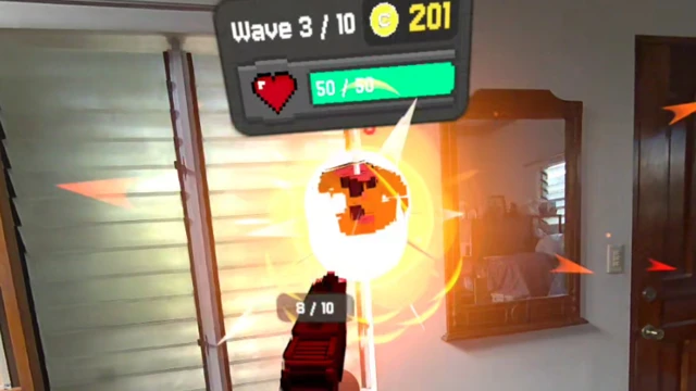 Enemies come alive in your room through passthrough MR, appearing on floors, walls, or even floating from ceiling corners. Fire the wrong color, and you’ll take damage; fail to dodge a projectile, and your health drops. Reloading requires tactical movement—simply pull your gun outside the headset’s view to restock ammo. Each stage challenges your speed, accuracy, and spatial awareness with 10 waves of intense, color-based combat.