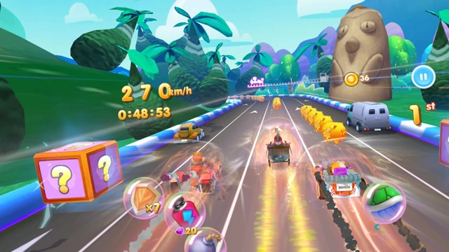 Choose your kart from a lineup of unique combat vehicles, each with its own style and feel. Customize and upgrade your kart to improve speed, handling, and special abilities. Collect power-ups during races to gain temporary advantages, block enemy attacks, or strike back at rivals who get too close.