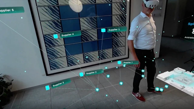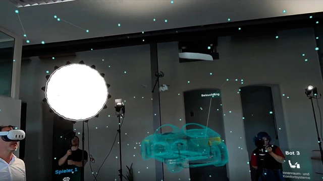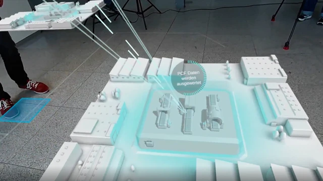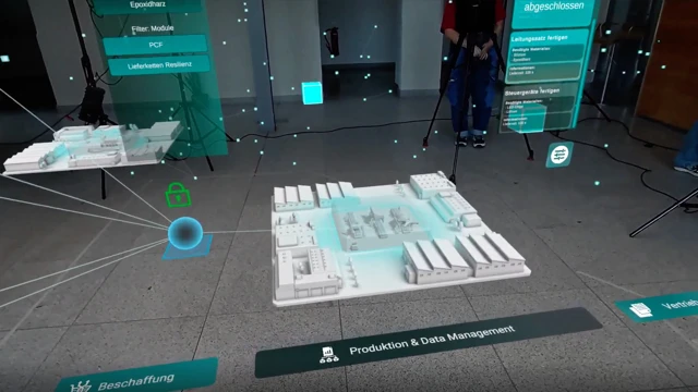 The game uses a Virtual Board (mapped on a table) with real-time events to represent the own production site and the physical space around this area to visualize the Supply Chain Network. The FutureMobilityMover is representing the progress of the game and is visible in the center of the game. Each Component of the FutureMobilityMover can be selected individually and represents a quest for players to solve. A quest is completed once the component has been built.