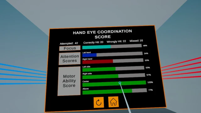 The Hand Eye Coordination game challenges players with fast-paced interactions where colored cubes approach from different directions. Players must respond quickly by hitting each cube with the correct color hammer and in the correct direction. This game is designed to assess motor ability, attention, and focus.