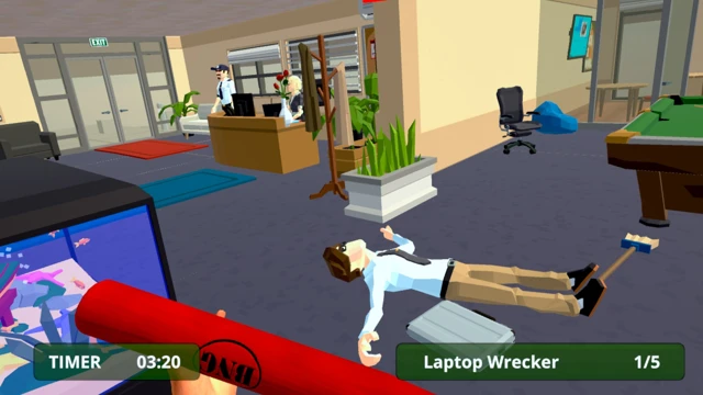 Use playful tools like a foam blaster, toy shooter, baseball bat prop, toy bat, rubber hammer, and office gadgets to create harmless, comedic destruction. Prank office workers, annoy the boss, interrupt meetings, flip desks, and confuse the friendly security guard trying to keep order. Enjoy exaggerated ragdoll physics, physics sandbox freedom, and endless opportunities for office pranks, boss simulator challenges, and funny job moments.