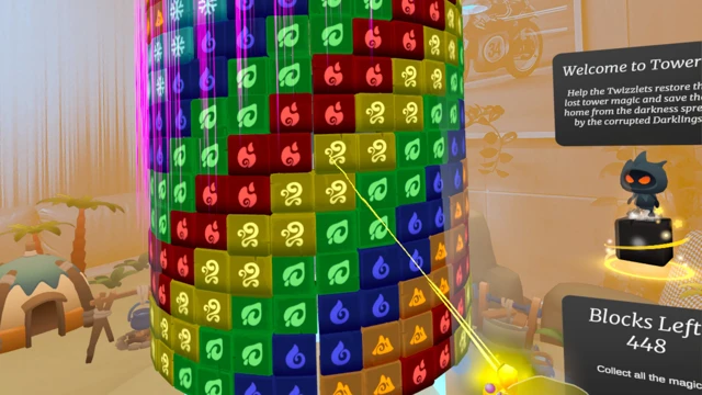 Toweris transforms classic match-3 gameplay into an immersive Virtual Reality puzzle experience. Grab a vibrant, colorful tower in front of you, rotate it with your hands, and match bright blocks to solve satisfying spatial puzzles from every angle.