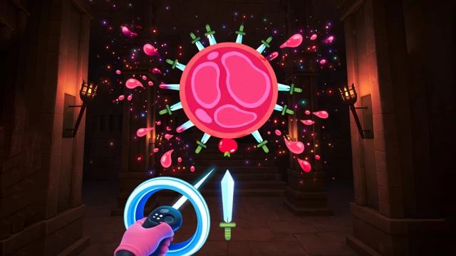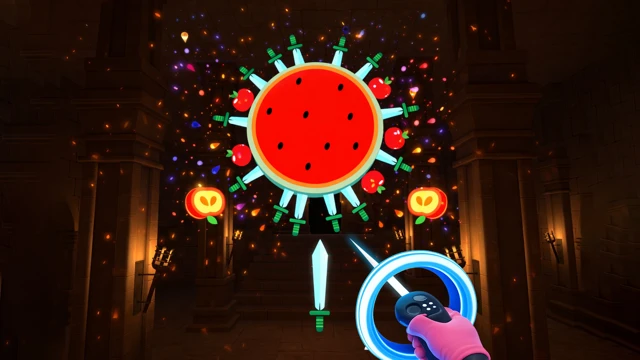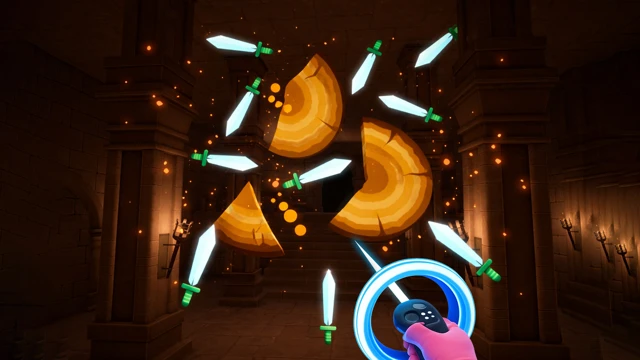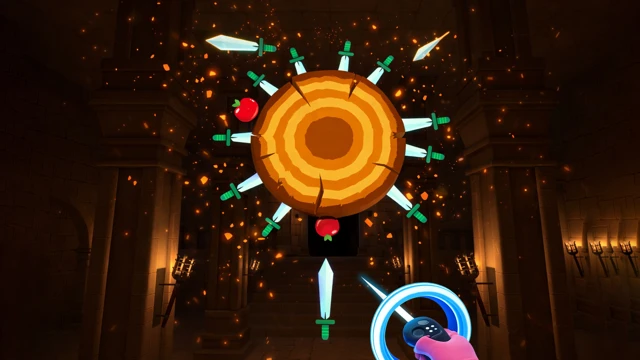 Step into a medieval dungeon and put your throwing skills to the test with VR Knife Hit. This addictive arcade-style game brings the thrill of precision knife throwing to your Meta Quest. Your objective is simple: throw your knives into the rotating logs to break them, but be careful—hitting your own knives will end your run!
