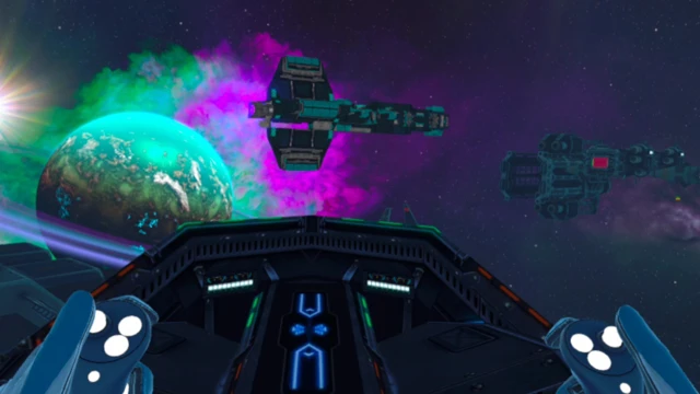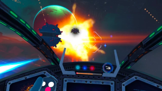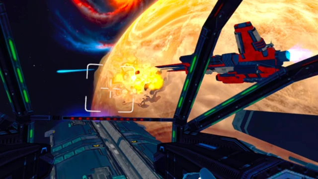 Each mission begins as your ship tears out of a wormhole into a hostile zone: asteroid belts, minefields, planetary debris, and enemy squadrons. You don’t have to worry about steering the ship itself—the invisible rail handles your flight path—so you can focus completely on what matters: aiming, reacting, and surviving. You’ll track targets with your head and controllers, swap between weapons, and constantly decide what to prioritize: the fighter in your face, the heavy cruiser powering up a broadside, or the asteroid that’s seconds away from turning your ship into scrap.